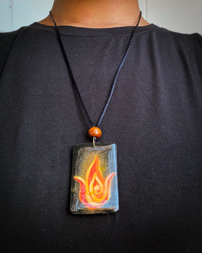 A handpainted elemental talisman, sealed in resin and finished with an adjustable black nylon cord.